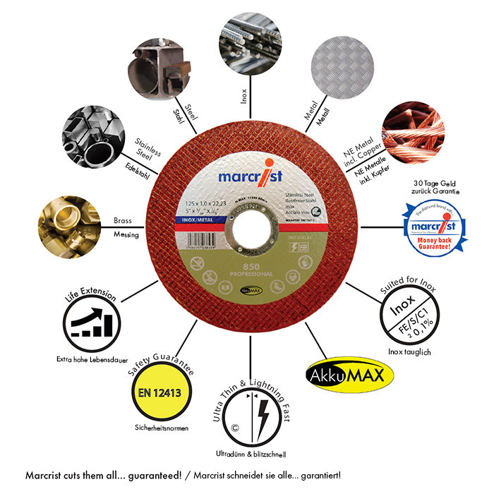 AkkuMAX cutting disc sets the standard in safety, life, cutting speed and cut finish on all metals including stainless steel, steel, high tensile steel, steel alloys