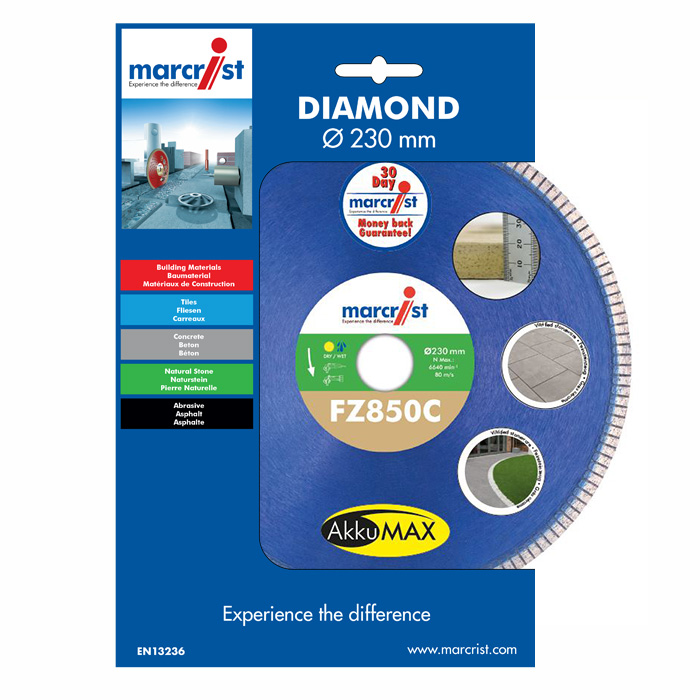 The FZ850C is the world’s first diamond blade for cutting curves and shapes in up to 3 cm outdoor porcelain paving slabs wet, dry, tear-free, and precise.