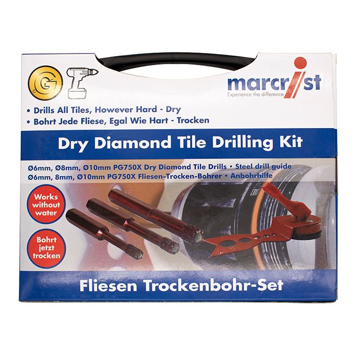 4 Piece Complete Set with Professional Drill Guide and Ø 6mm, Ø 8mm, Ø 10mm PG750X Hex Diamond Porcelain Dry Drills with Hexagonal Shaft. Drills hardest porcelain with ease. Ideal RPM: > 2500 RPM. Each drill lasts 60 - 100 holes in hardest porcelain
