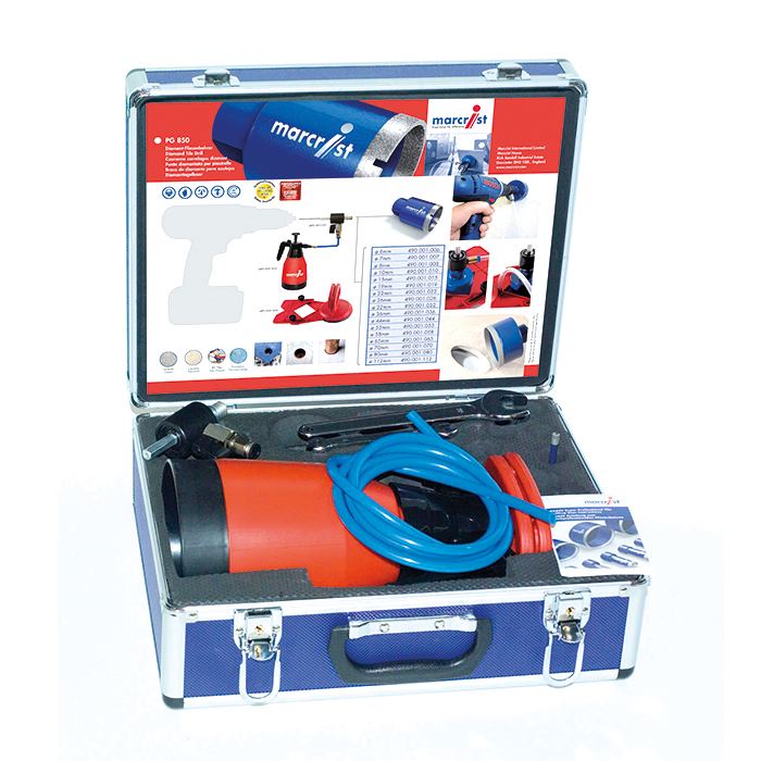 Set Contents: Professional water swivel with micro adjustments, PG850 Tile drill Ø 6mm, 2m Ø 8mm water hose, 1 Litre water pressure bottle, Universal Starter, Aluminium case, foam insert for additional drills, drill ejector, key set Ø 10mm-22mm